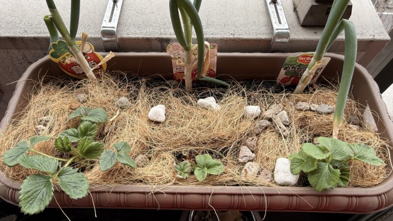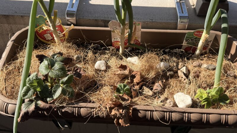 ネギはとても元気(すでに2回収穫)ですが、「デルモンテのめちゃうま!いちご」が寒さで弱っています。